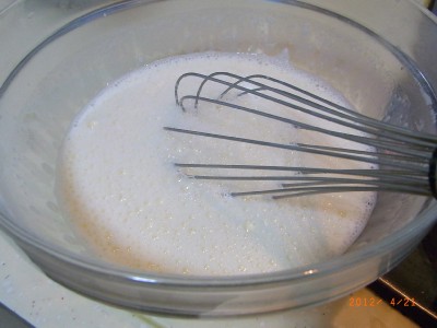 ボウルに卵もいれてさらによく混ぜ合わせ、温めた牛乳を一気に入れて混ぜ合わせる。