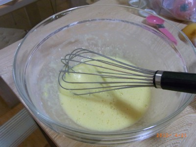 ボールに卵・砂糖を入れ、混ぜます。(ケーキのようにしっかり泡立てなくても、ざっと混ぜる感じでOK)