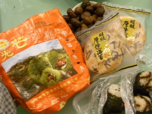 Nさんから旺旺の「厚焼海苔」というおせんべいと煎り栗、