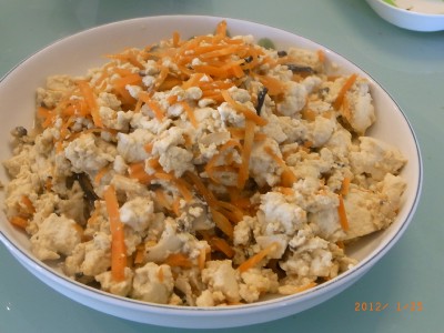 今日ご紹介するのは、炒り豆腐。ちょっとだけ中国風に、手に入りやすい干しえびを使って作ります。炒め物や煮物に使うととってもおいしいだしがでますよ。干しえびは中国語で海米(hai3mi3)、もしくは虾仁干(xia1ren2gan1)です。北京では海米がよく使われる表現でしたが、杭州では虾仁干のほうが通じやすいようです。水に浸して戻してから使います。