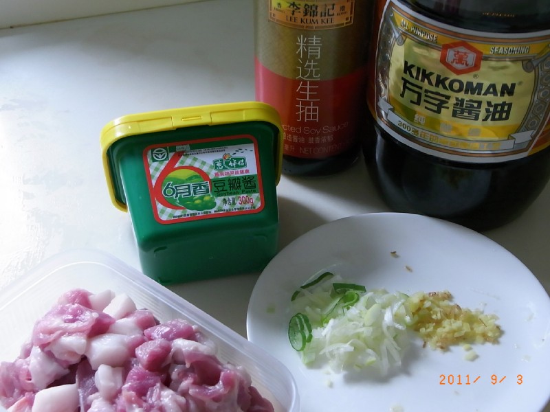 肉の表面の色が変わったら、酒、しょうゆ、生抽、砂糖、味噌を入れて少し煮ます。 この段階でお肉は生でも大丈夫