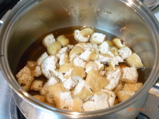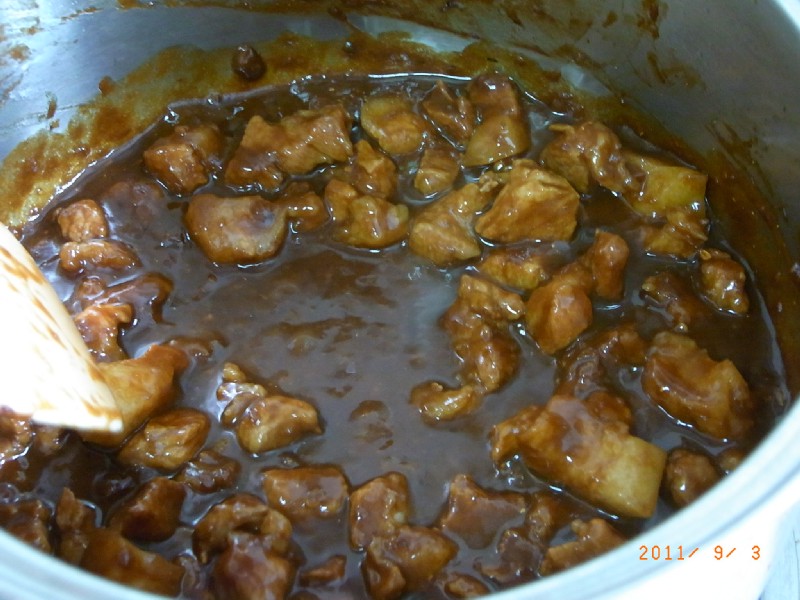 肉の表面の色が変わったら、酒、しょうゆ、生抽、砂糖、味噌を入れて少し煮ます。
