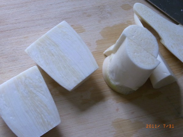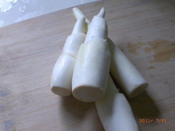 マコモダケは緑の皮をむいて4センチの輪切りにし、さらにたて半分に。