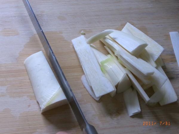 マコモダケは中国語で茭白(jiao1bai2)。竹の子のようなさくさくとした歯ざわりが特徴です。