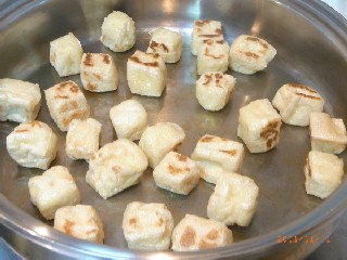 どの豆腐屋さんにも大体あるのが、四角いブロックの形をした油豆腐。このお店には大きいのと小さいの、平べったいの(大きさ2種類、日本のものよりは厚め)があります。今回は大きい油豆腐を使って煮浸しを、小さい油豆腐でお酒のおつまみ(ご飯のおかずにもなるかも?)を作ります。