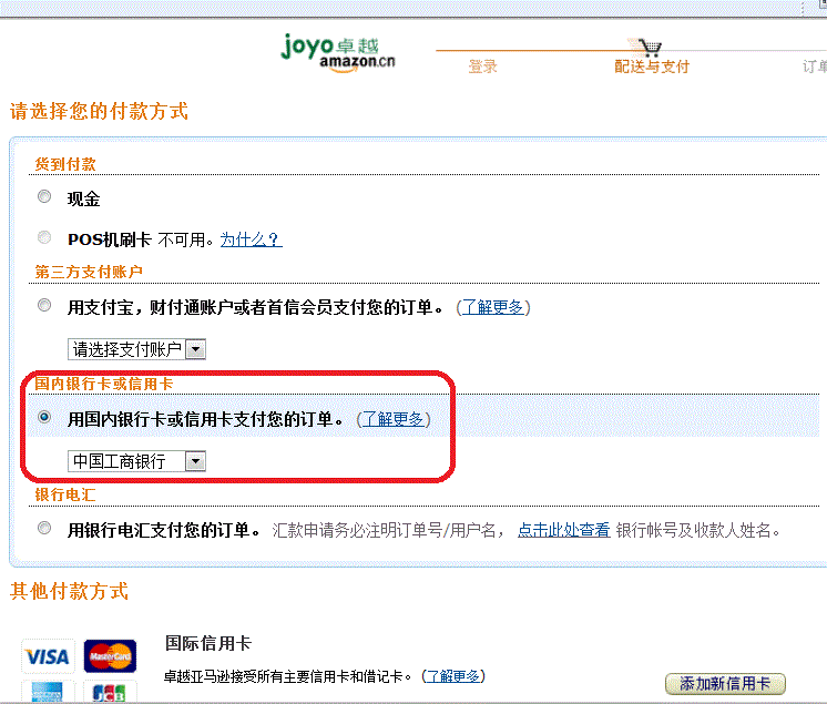 さらに次は、決済方法の選択になります。先述した銀行のネット決済準備ができている場合は、「国内银行卡或信用卡」のカテゴリをチェック、銀行は自分の口座のある銀行をセレクト。