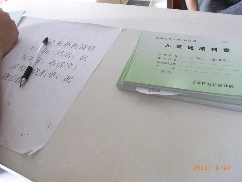 儿童健康档案と書かれた冊子、そして冊子に挟まれていた紙2枚(化验单)に、子パンダの名前や誕生日、幼稚園の名前などを書き込んでおく。